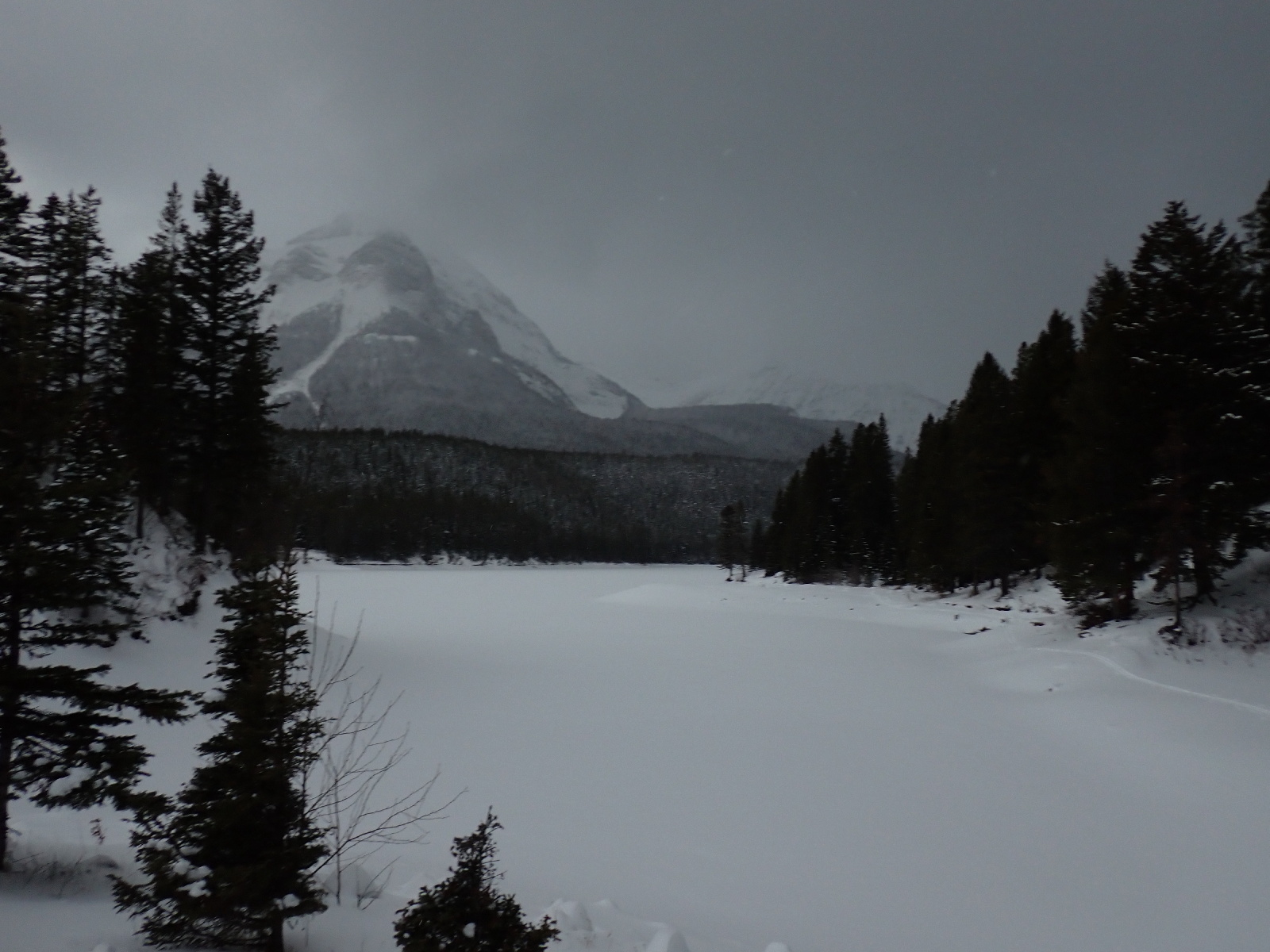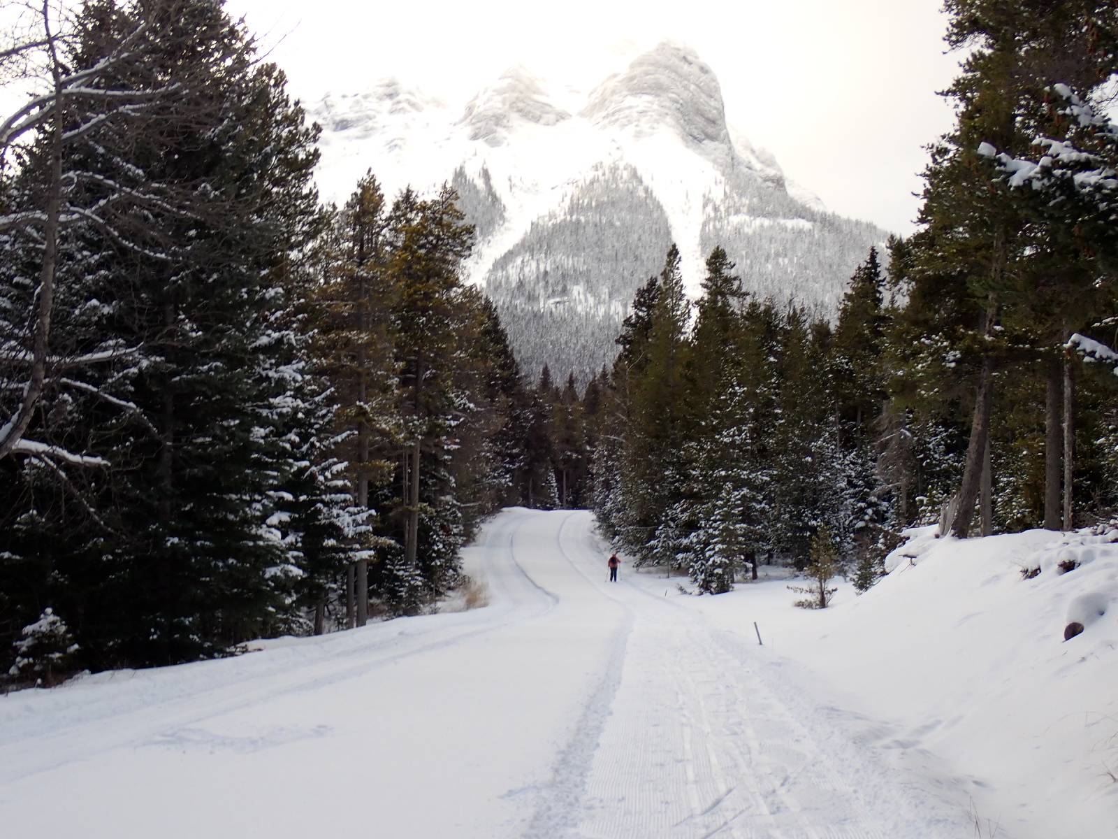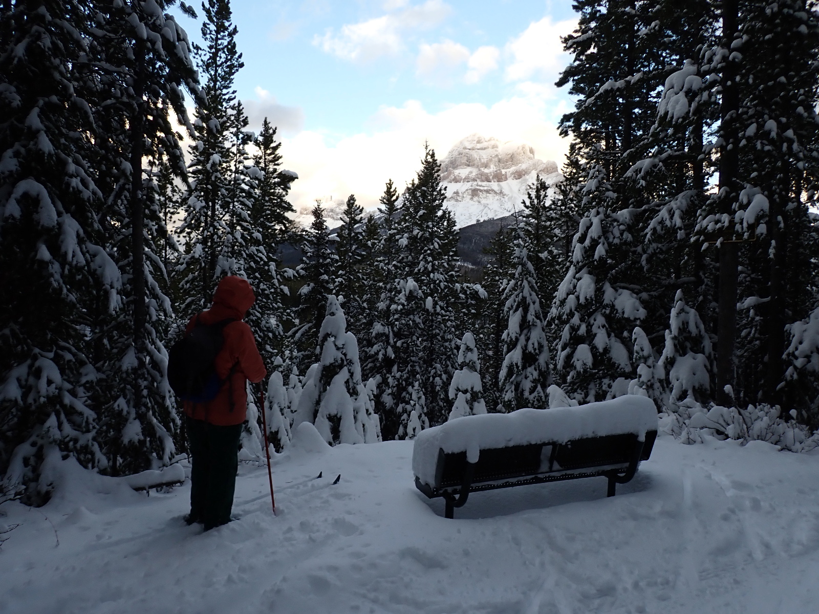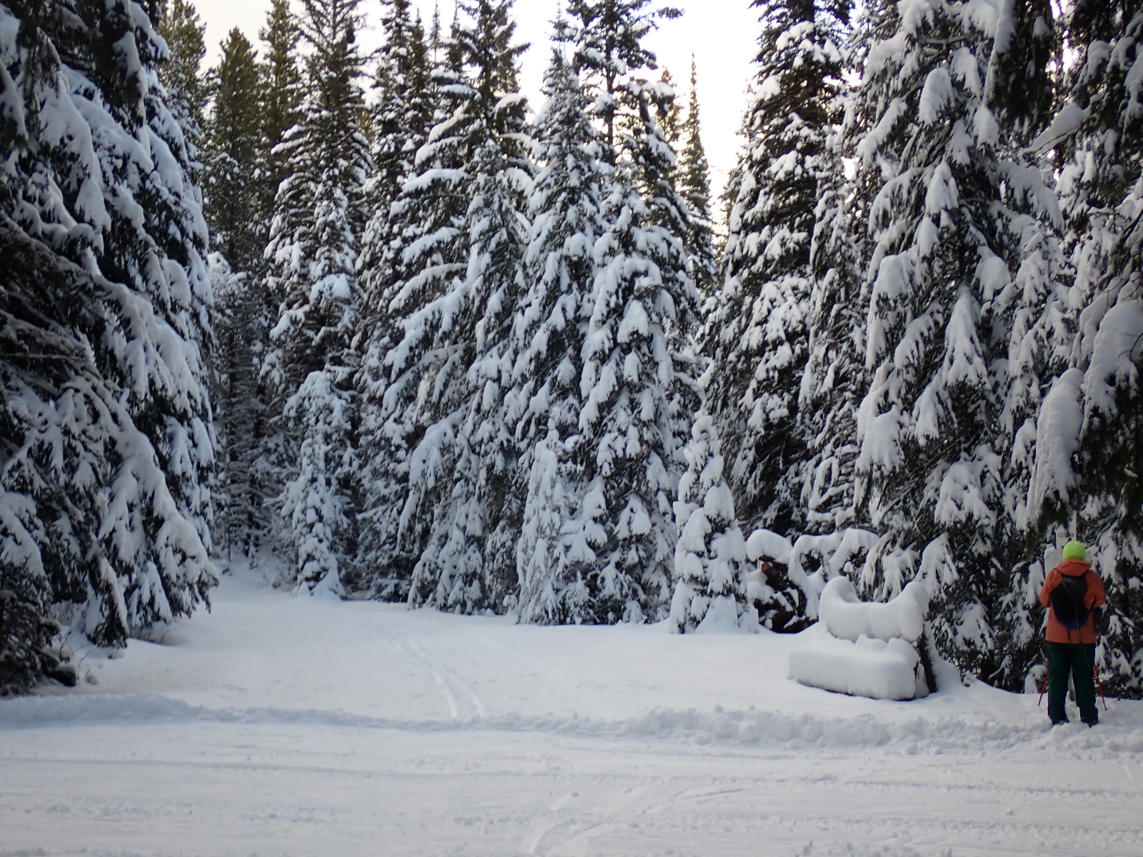 After seeing all the snow at the “Darknight” ski we went out to the trails again this afternoon. We skied Mainline, Marten and part of WhiskeyJack before heading down the hill to the lake. We then went along Otter to the west end of the lake before returning along the north side of the lake and Rainbow back to the parking area. Between 40 and 50 kms of snow lying on many of the trails. The earlier exceptionally strong winds brought down over 40 trees which the grooming crew have been clearing. We met 2 guys clearing the Rabbit Trail today. Other trees are succumbing to the weight of snow on them. I dragged 2 trees off Marten and 2 trees off Otter. Β There is still one larger tree across Otter. The grooming crew are busy out there clearing trees and packing the trails. It will take some time before everything is groomed and trackset.