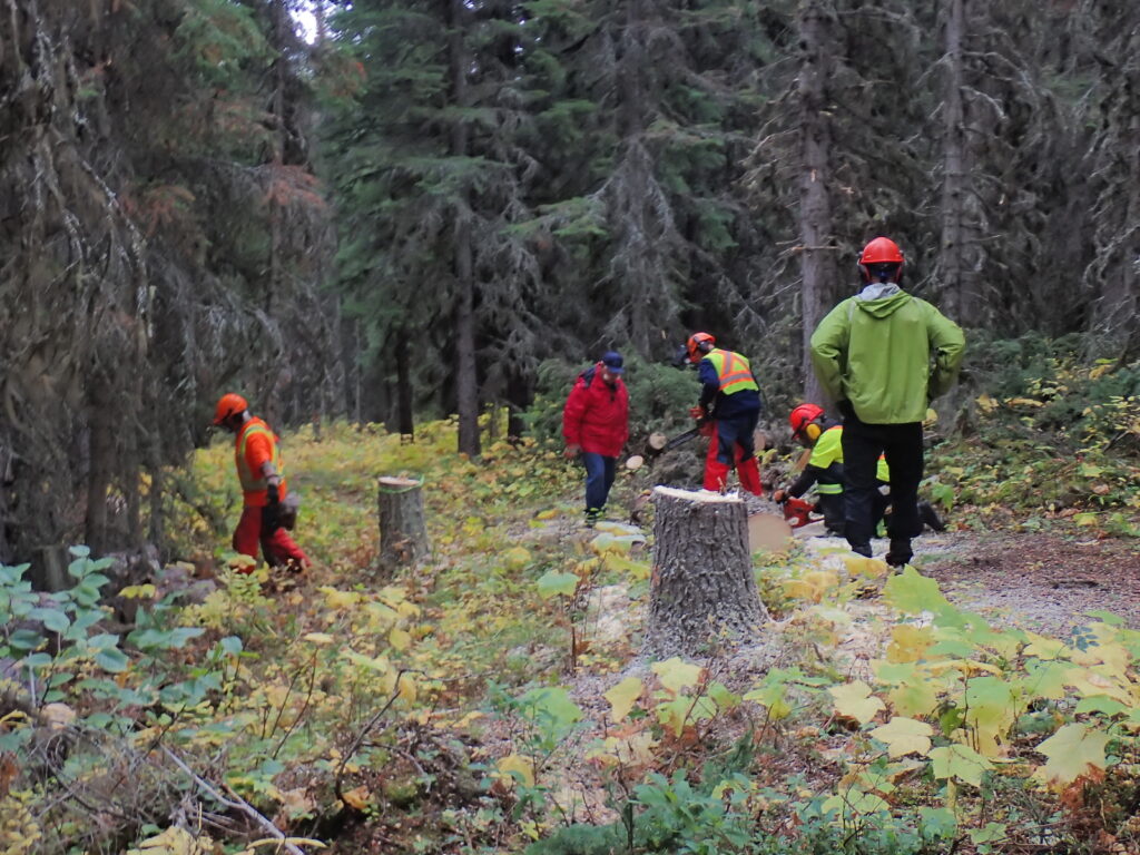 There are a few club members, one in particular, who rarely stop thinking about the ski trails and the ski club. They are always planning improvements or working on the equipment to ensure an enjoyable experience for all of us and an even safer environment for the groomers to prepare our trails when the snow falls. As part of this 6 people were out on the trails last Thursday and 9 people yesterday. Some trees were felled to widen parts of Camp, Mill, Cutoff and Hairpin to make it easier for groomers and skiers and to prepare for more trails to be suitable for skate skiing. 4 chainsaw certified volunteers did the chain saw work, some using their own equipment, and then the others helped clear the wood off the trails.